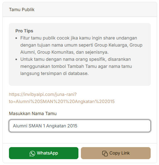 | Lebih cocok digunakan untuk mengirim undangan khusus/spesifik. | Lebih cocok digunakan untuk mengirim undangan secara publik (undangan atas nama grup). |